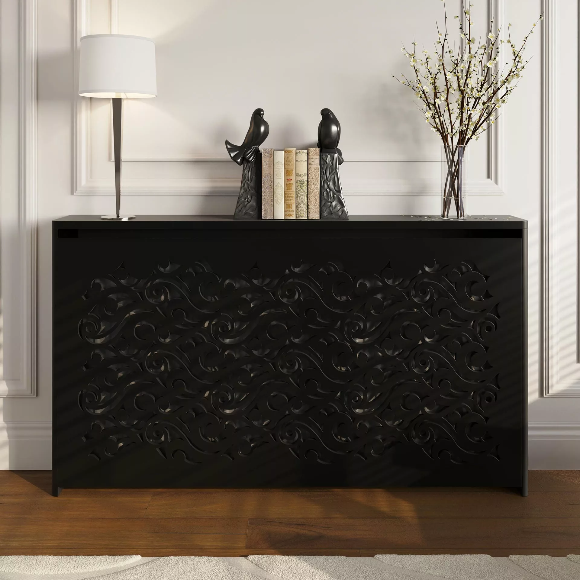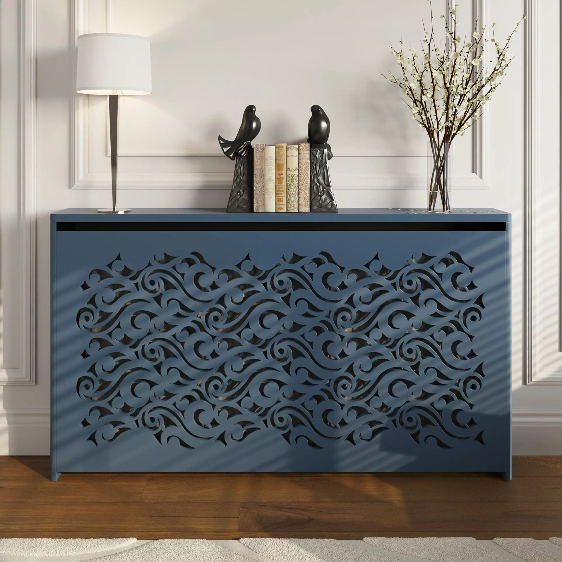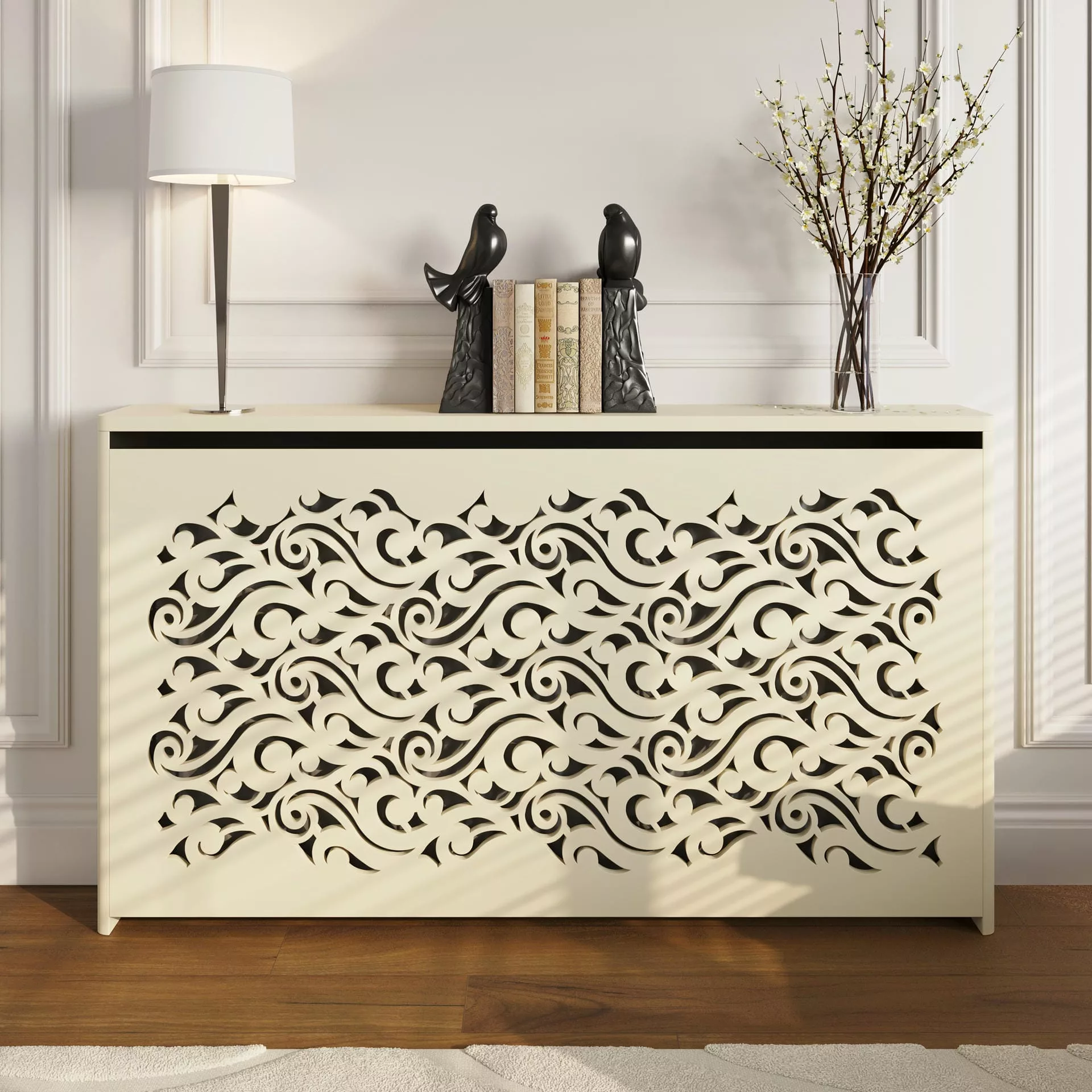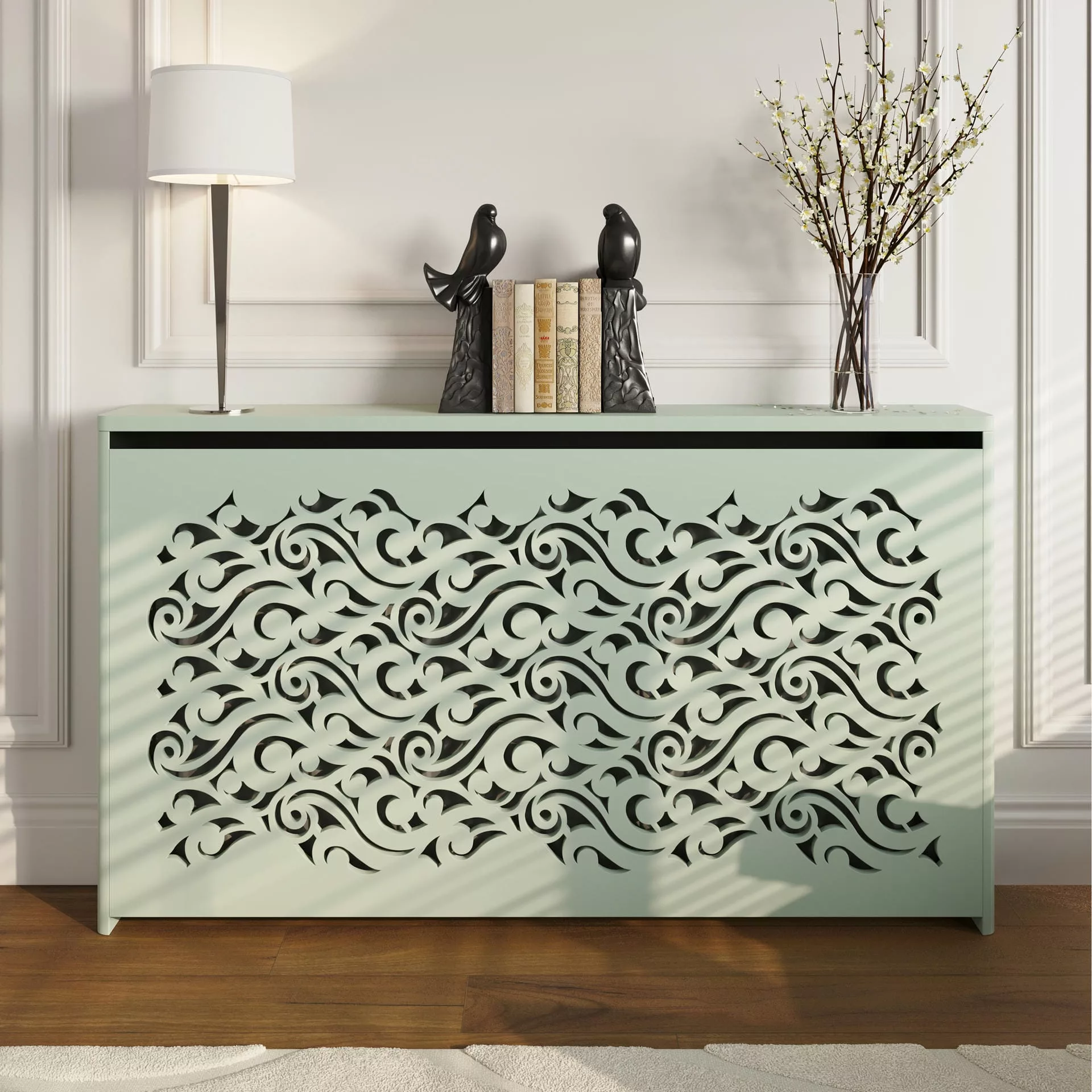The exuberant, romantic design of this floor-standing cabinet creates an eye-catching statement in your home while also concealing your radiator and providing shelving for homeware accessories.