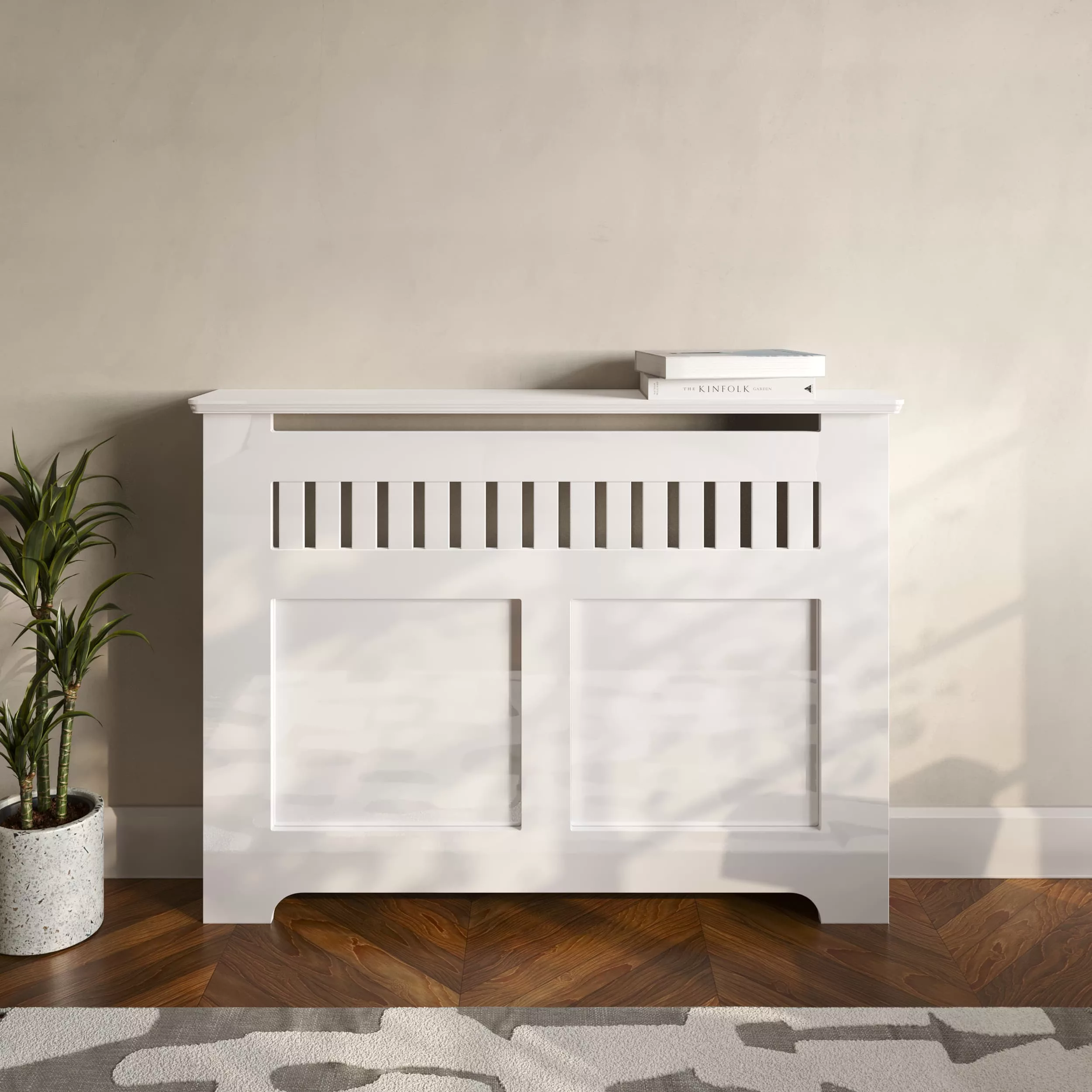Floor standing, built-in furniture feel. Obscures any blemishes underneath the radiator. Securly fixes into the wall using discrete internal brackets.