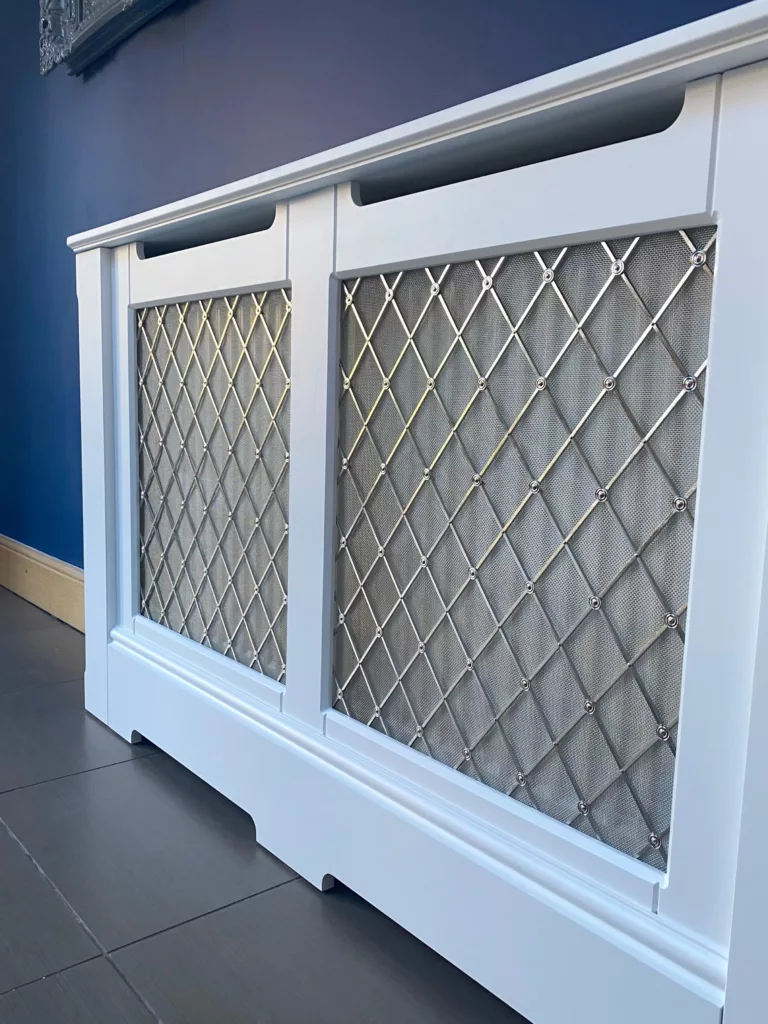 A heritage feel with brushed nickel (silver) rods and rosettes on a fine backing mesh.